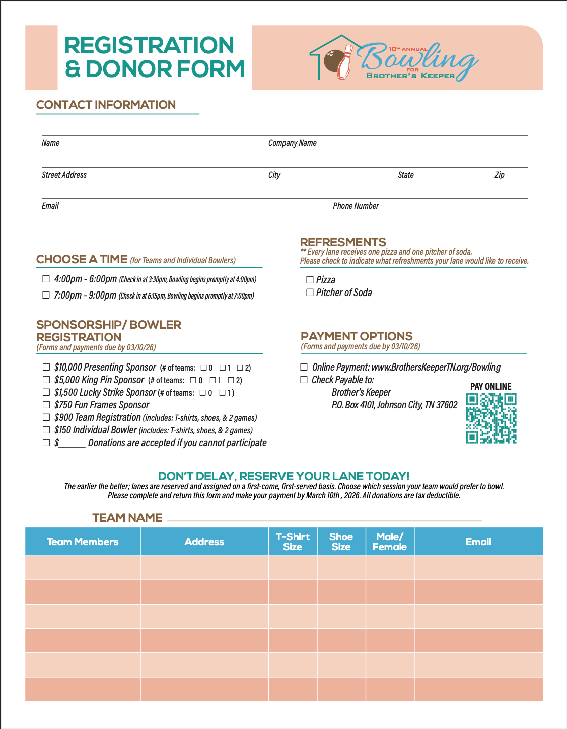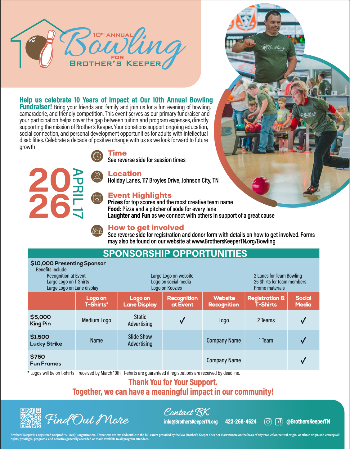 Our 10th Annual Bowling for BK will be held on Friday, April 17th at Holiday Lanes in Johnson City, Tennessee! We will have sessions at 4:00 and 7:00 pm again. You can pay online below. All information and registration can be found on the brochure below! Download the digital version here.